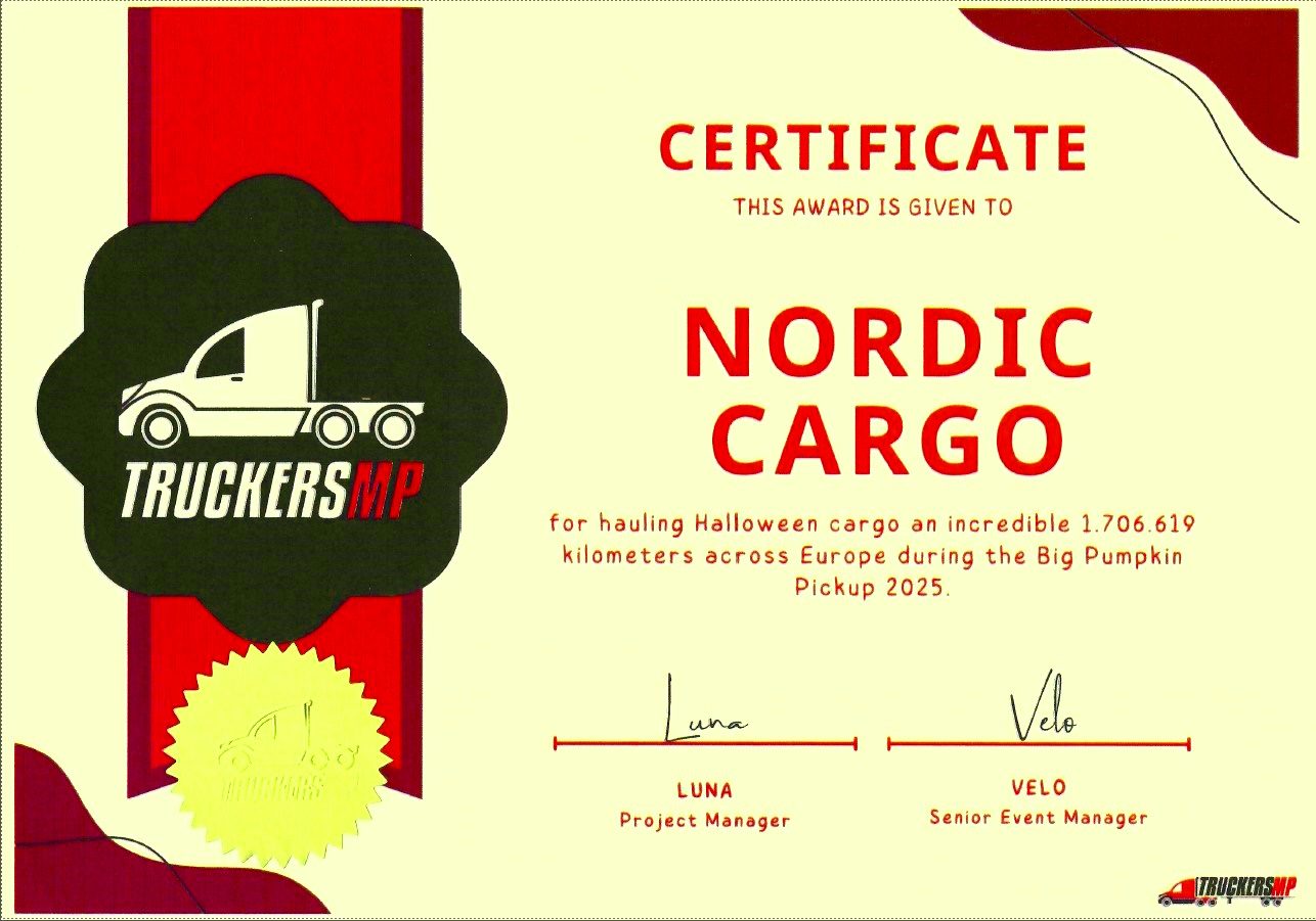 Die NORDIC CARGO sicherte sich am 05.11.2025 beim weltweit ausgetragenen TMP Halloween Big Pumpkin Pickup Event 2025 den 1. Platz für die meistgefahrenen Kilometer und wurde für diese herausragende Leistung mit dem TMP Award ausgezeichnet.